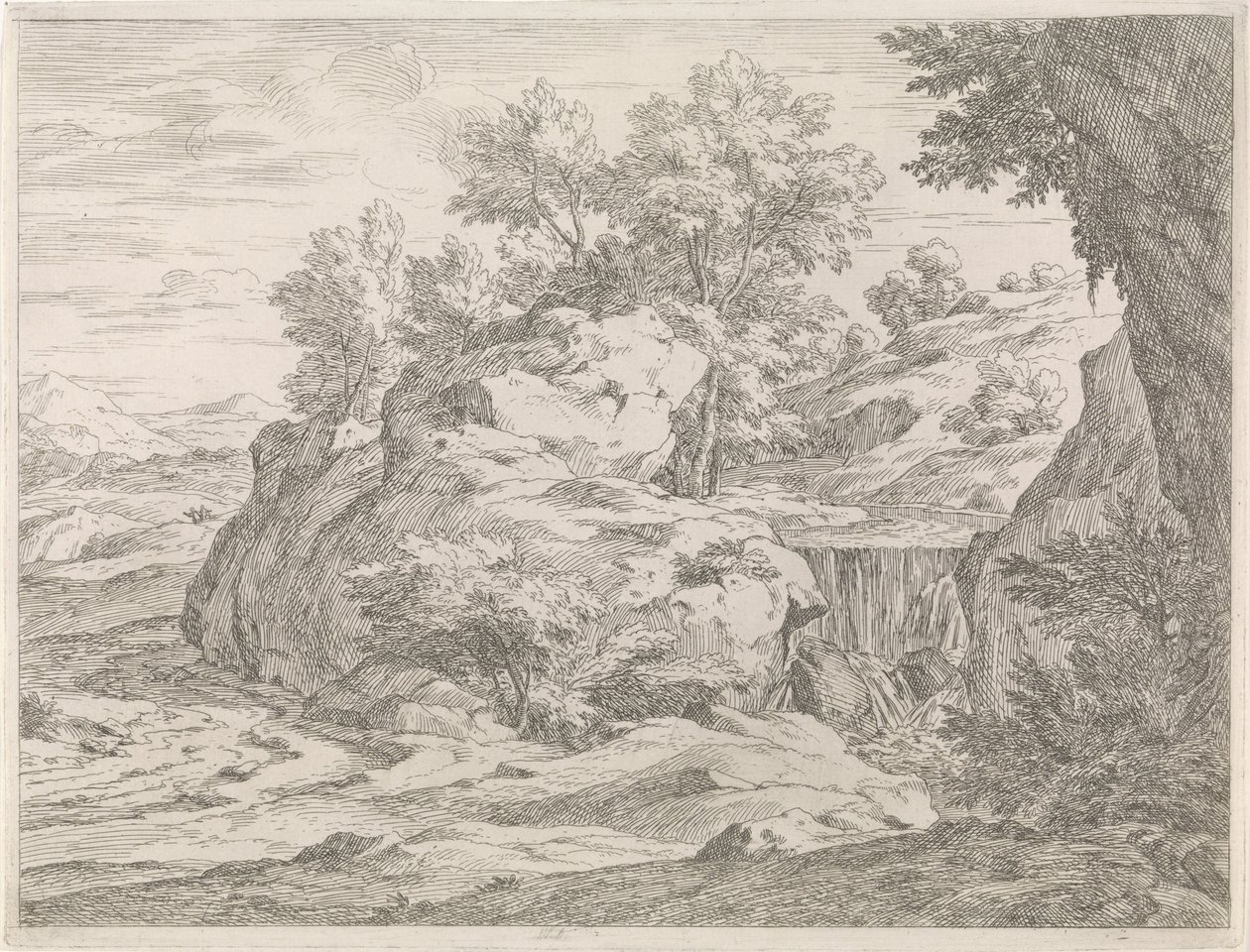 Landschap met waterval(Landschap met waterval Rivierlandschappen (series title))Abraham Genoels(print maker),Abraham Genoels(after design by),Adam Frans van der Meulen(publisher) |