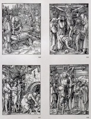 De 'Kleine Passie' serie (kloksgewijs): Het verraad van Christus; Christus voor Annas; Christus voor Kajafas; de bespotting van Christus, gepubliceerd 1511(The 'Small Passion' series (clockwise): The Betrayal of Christ; Christ before Annas; Christ before Caiaphas; the Mocking of Christ, pub. 1511 )Albrecht Dürer |