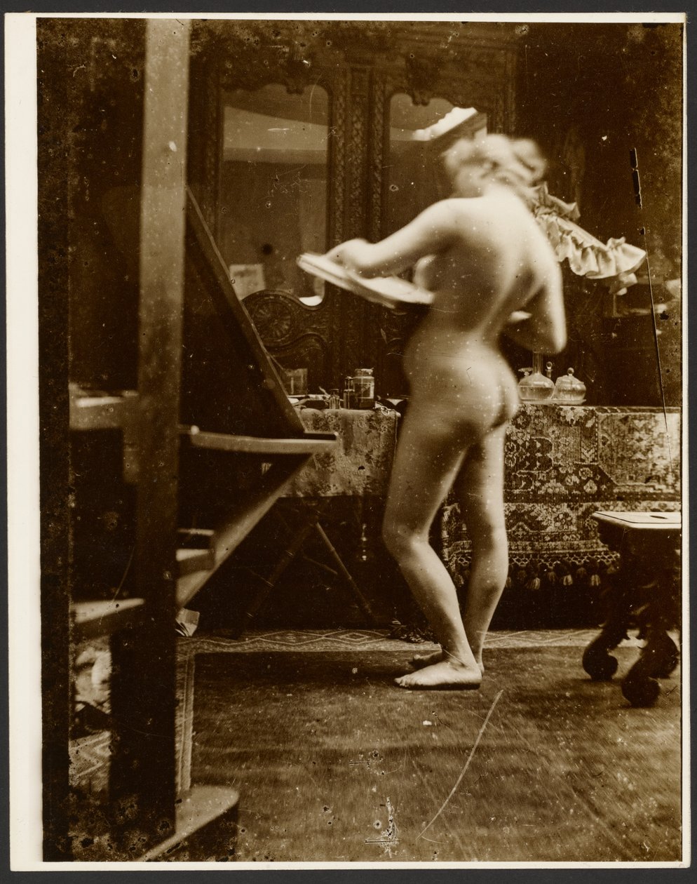 [vrouwelijk naaktmodel staand in studio met schetsboek].([Female Nude Model Standing in Studio Holding a Sketchbook])Alphonse Maria Mucha(Photographer) |