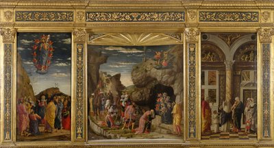 Driekoningen, middelste deel van een drieluik (tempera op hout)(Epiphany, center part of a triptych (tempera on wood))Andrea Mantegna |