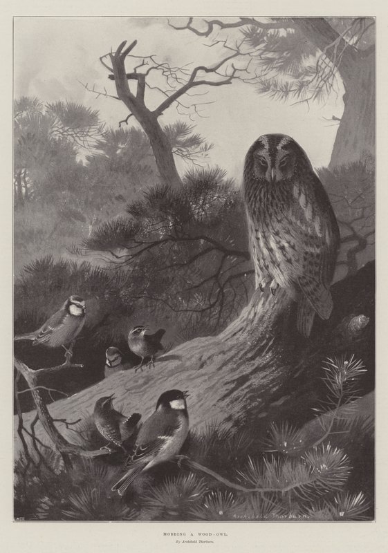 Een bosuil lastigvallen(Mobbing a Wood-Owl )Archibald Thorburn |