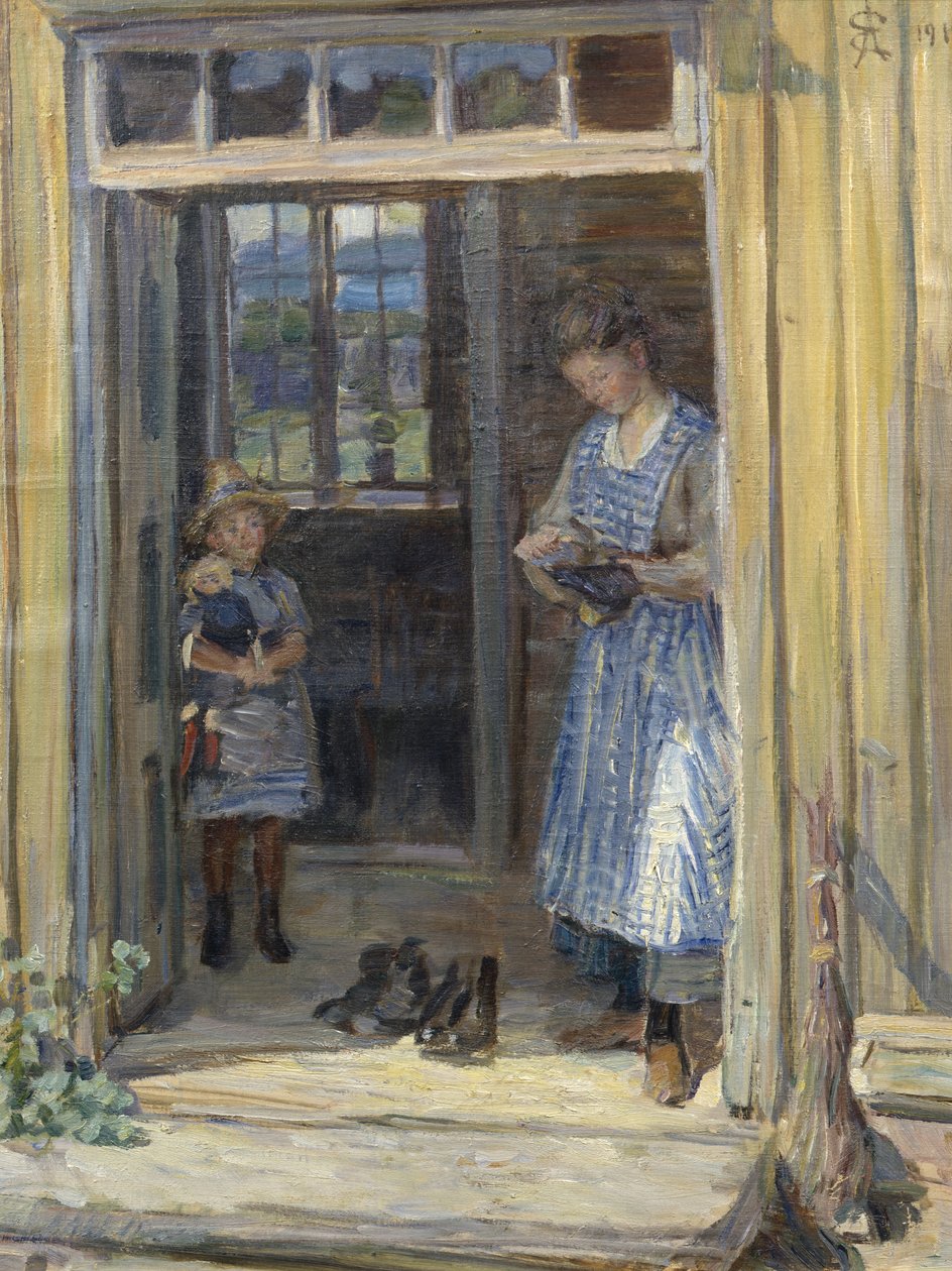 Vrouw en meisje in deuropening(Woman and girl in doorway)August Eiebakke |