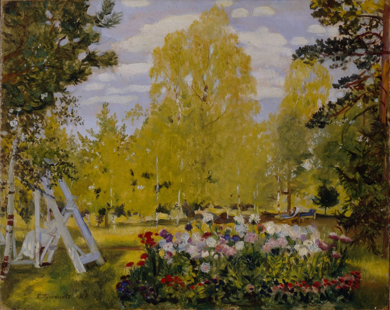Landschap met een bloembed(Landscape with a Flower Bed)Boris Mikhailovich Kustodiev |