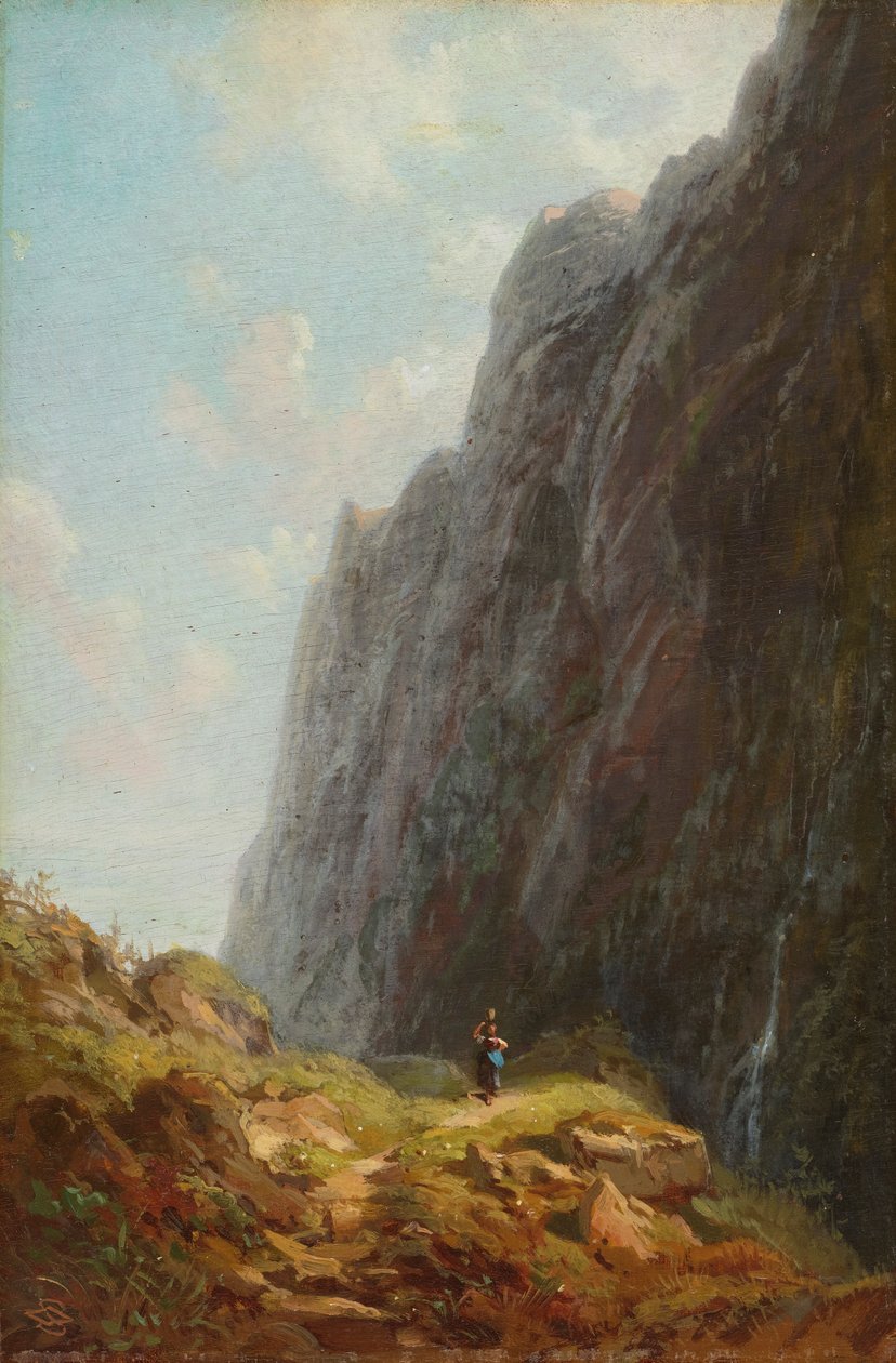 Berglandschap met herderin in het Wendelstein-gebied(Gebirgslandschaft mit Sennerin im Wendelsteingebiet)Carl Spitzweg |
