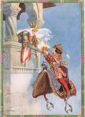 "Ze zag die kroon en smeekte hem haar die te geven" (kleurenlitho)("She saw that crown and begged of him to give it her" (colour litho))Charles Edmund (after) Brock |