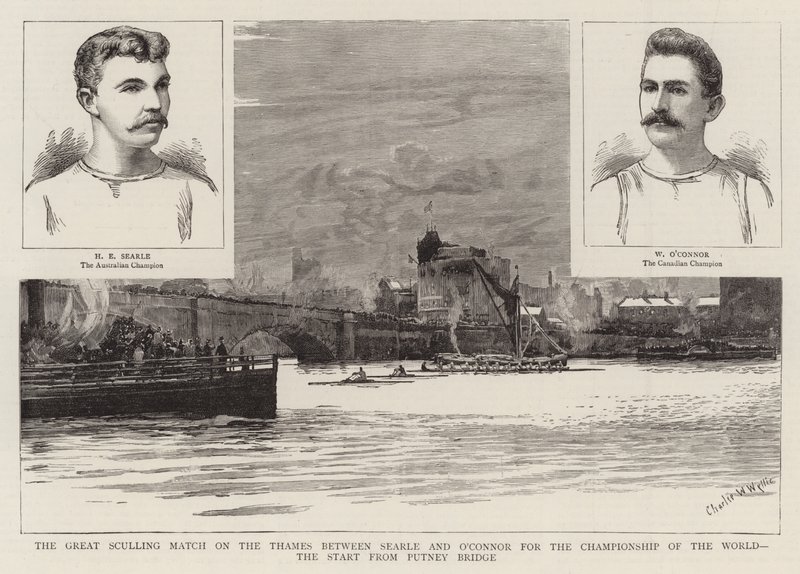 De grote roeirace op de Theems tussen Searle en O'Connor voor het wereldkampioenschap, de start vanaf Putney Bridge(The Great Sculling Match on the Thames between Searle and O'Connor for the Championship of the World, the Start from Putney Bridge )Charles William Wyllie |