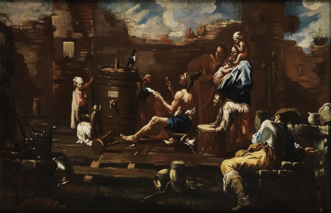 Kermisgroep oefent met een pratende raaf(Schaustellergruppe beim Üben mit einem sprechenden Raben)Circle of Alessandro Magnasco |
