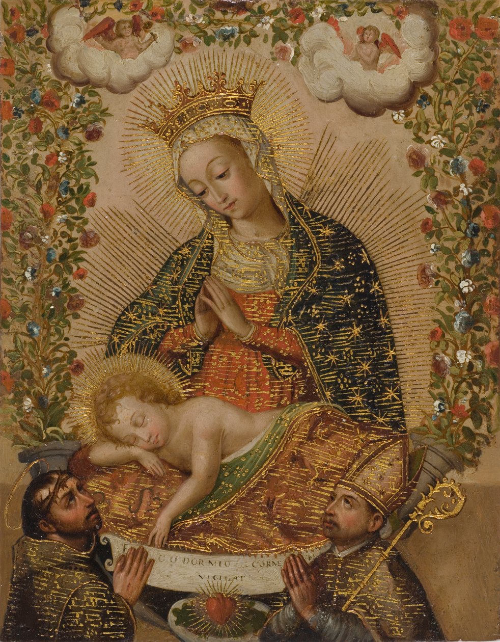 De Maagd die het Christuskind Aanbidt met Twee Heiligen, 18e eeuw(The Virgin Adoring the Christ Child with Two Saints, 18th century (oil with gold on copper))Cuzco School |