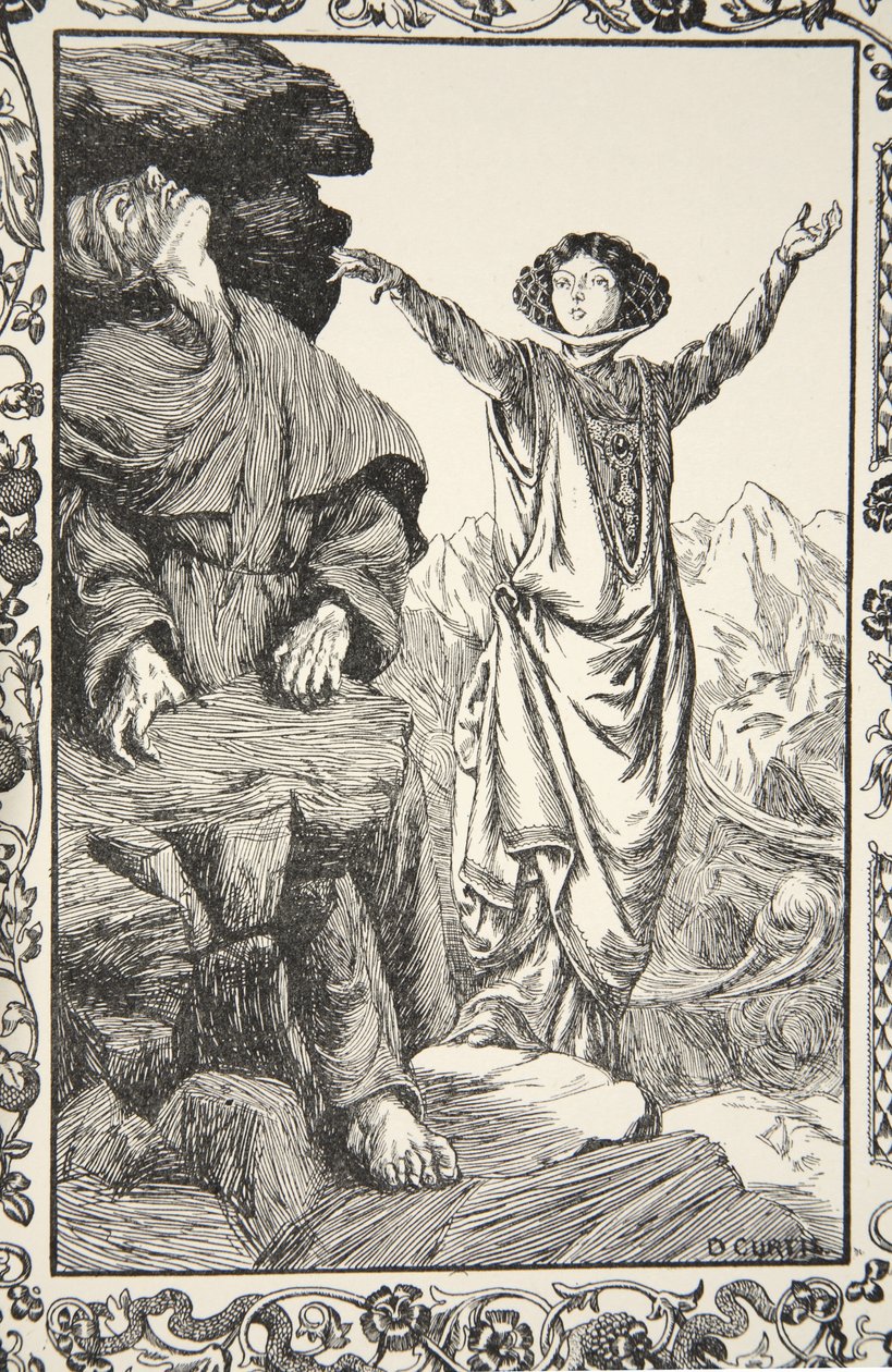 Zij zorgde ervoor dat de rots stopte, illustratie uit 'Verhalen van Koning Arthur en de Ronde Tafel' door Beatrice Clay, 1e editie, 1905(She caused the rock to shut down, illustration from 'Stories of King Arthur and the Round Table' by Beatrice Clay, 1st Edition, 1905 )Dora Curtis |