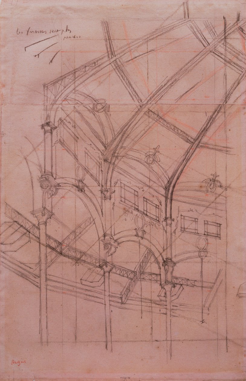 Le Cirque Fernando - architectonische studie(Le Cirque Fernando - architectural study (black and red chalk and pencil on two sheets of joined paper))Edgar Degas |