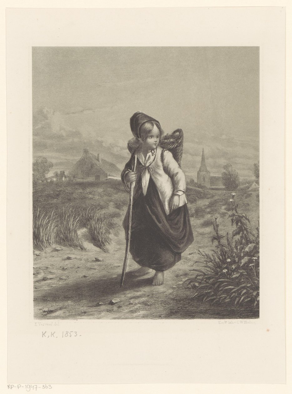Meisje met mand op de rug(Girl with a Basket on Her Back)Elchanon Verveer(print maker),Elchanon Verveer(after design by),Koninklijke Nederlandse Steendrukkerij van C.W. Mieling(printer) |
