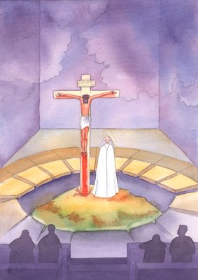 Bij elke Mis zijn we aanwezig bij het Offer dat eens werd gebracht op Golgotha, toen Christus voor ons leed en stierf, terwijl Zijn Moeder bij Hem stond, 2005 (aquarel op papier)(At every Mass we are present to the Sacrifice once offered on Calvary, when Christ suffered and died for us, as His Mother stood by Him, 2005 (watercolor on paper))Elizabeth Wang |