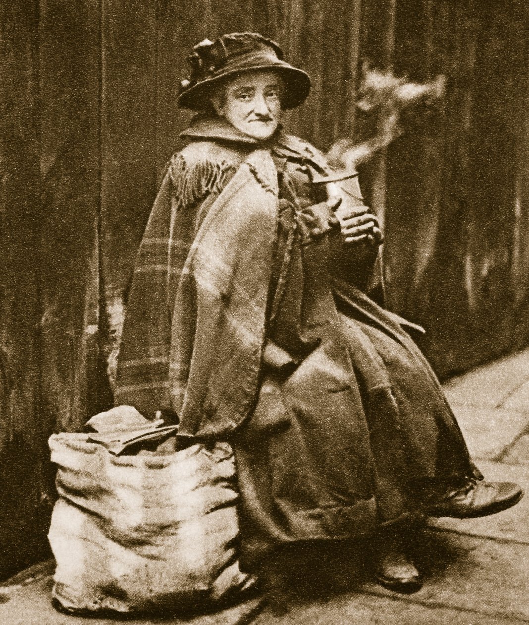 Een straatdame drinkt thee uit een typisch East End bierblikje, nabij Fleet Street(A street lady drinking tea from a typical East End beer can, near Fleet Street (sepia photo))English Photographer |