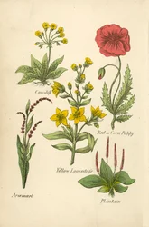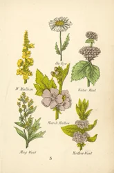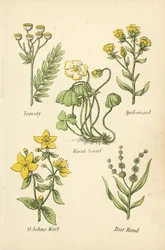 Gele Lis, Zuiverende Vlas, Verfplant, Varkensvenkel, Vlooienkruid, Kamille Kalmoes, Vlas, Mannetjesvaren, Guldenroede, Ischiaskers Vingerhoedskruid, Ooievaarsbek, Grote Stinkende Gouwe, Hoefblad, Puntige Zuring, Kattenkruid Zevenblad, Gromwell, Hartstongue, Gold of Pleasure, Gladwyn Walstro, Kruiswortel, Wilde Wortels, Bekermos, Vogelmuur Beek Limoen, Zeepkruid, Adderwortel, Duizendguldenkruid, Bugel Aardnoot, Koortskruid, Korenbloem, Kikkerbeet, Fluellin Paarse Kattenstaart, Scheurbuikgras, Waterlelie, Hondstong, Muurpeper (kleur litho) All Heal, Koekoeksbloem, Vijgenkruid, Moeder van Tijm, Duivelsbit, Orchis Arabis Alpina, Aubrietia Deltoidea, Alyssum Saxatile, Erysimum Perowskianum Look-zonder-look, Gevlekte Scheerling, Lange Cyperus, Jeneverbesstruik, Levermos, Hyacint Polypetalous planten, onregelmatig Spiraea Douglasii, Spiraea Prunifolia, Spiraea Thunbergii, Kerria Japonica Zeekraal, Duivenkervel, Waterdrieblad, Baren Wort Rhododendron Flavum, Rhododendron Dahuricum, Forsythia Suspensa, Syringa Vulgaris Hysop, Betonie, Zelfgenezing, Lavas, Lavendel, Grondsel Bloeiende planten van Groot-Brittannië: Alpen Bartsia, Gele Kleverige Bartsia, Rode Bartsia, Gewone Oogentroost, Gewone Gele Ratel, Grote Bossige Gele Ratel Andromeda Hypnoides; Polygala Paucifolia; Cheiranthus Alpinus Linnaea Borealis; Hypericum Nummularium; Trientalis Europaea Centranthus Angustifolius, Scabiosa Atropurpurea, Morinia Longifolia, Ageratum Mexicanum, Ageratum Conyzodes, Ageratum Corymbosum Pagina met kleurillustraties uit Britse Wilde Bloemen naar een werk van J. E. Sowerby en C. P. Johnson Bloemen: Thorough Wort, Tansy, Sassafras, Valeriaan, Gele Vlag, Thee, Valeriaan, ca. 1940
