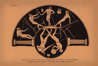 Oudgrieks onderwijs: Scène in een Palaistra, een jongen met halteres, een jongen met speer en twee paidotribai (litho)(Ancient Greek Education: Scene in a Palaistra, a boy with halteres, a boy with javelin, and two paidotribai (litho))English School |