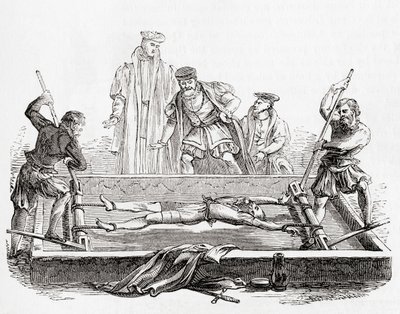 Man wordt gemarteld op de pijnbank, uit 'The National and Domestic History of England' door William Hickman Smith Aubrey (1858-1916) uitgegeven Londen, ca. 1890 (litho)(Man being tortured on the rack, from 'The National and Domestic History of England' by William Hickman Smith Aubrey (1858-1916) published London, c.1890 (litho))English School |