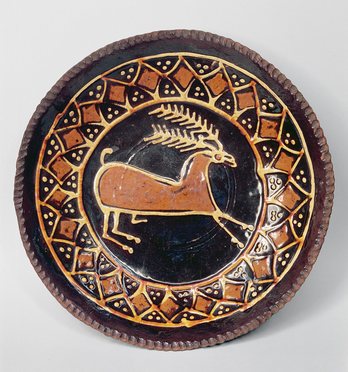 Staffordshire slipware schaal versierd met een hert, midden 18e eeuw(Staffordshire slipware dish decorated with a stag, mid 18th century (ceramic))English School |