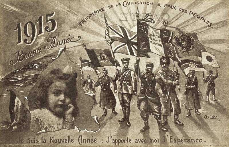 Nieuwjaarskaart voor 1915, wensend voor de triomf van beschaving en vrede onder de volkeren