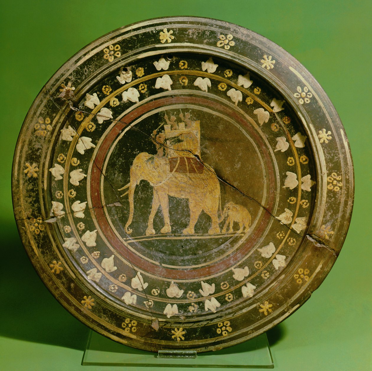 Schaal met een olifant gebruikt in oorlog tegen de Carthagers (keramiek)(Dish depicting a elephant used in war against the Carthaginians (ceramic))Etruscan |