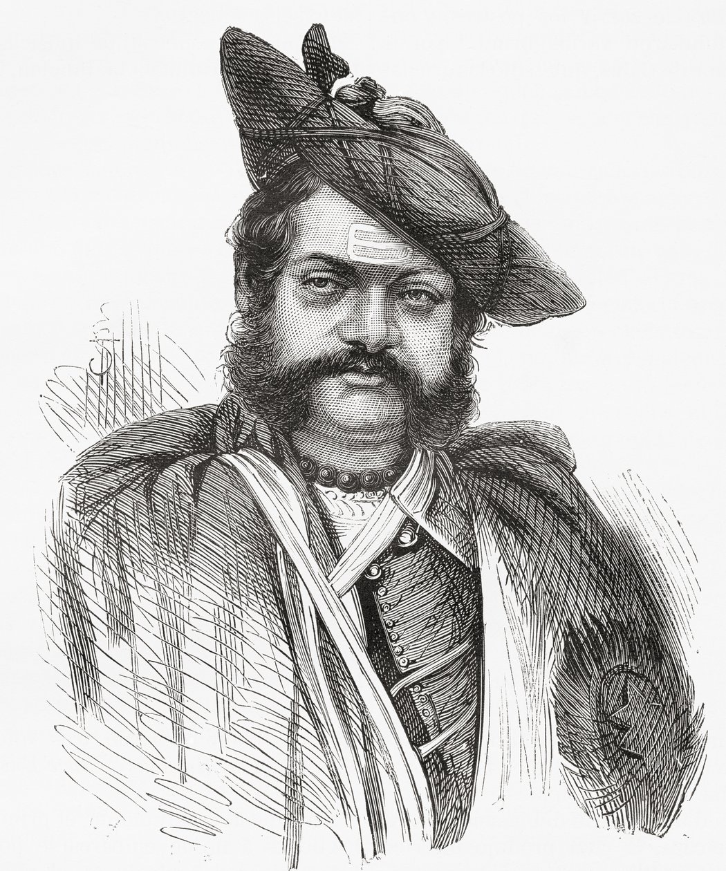 Jayajirao Scindia, Maharadja van Gwalior, illustratie uit 'El Mundo en la Mano', gepubliceerd in 1878(Jayajirao Scindia, Maharajah of Gwalior, illustration from 'El Mundo en la Mano', published 1878 )European School |