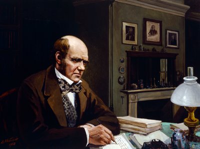 Charles Darwin, Brits natuur- en evolutiewetenschapper, aan het werk in zijn studeerkamer (schilderij op doek)(Charles Darwin, British naturalist and evolutionary scientist, working in his study room (painting on canvas))Evstafieff Evstafieff |