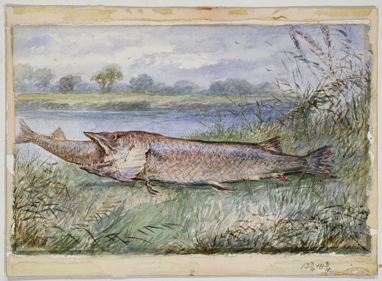 Een Verbazingwekkend Incident met een Jack Pike van 6lbs die probeert een Barbel van 1 34lbs door te slikken gevonden op Monkey Island, 1895(An Amazing Incident showing a Jack Pike of 6lbs attempting to swallow a Barbel of 1 34lbs found on Monkey Island, 1895 (wc on paper))F.J. Lees |