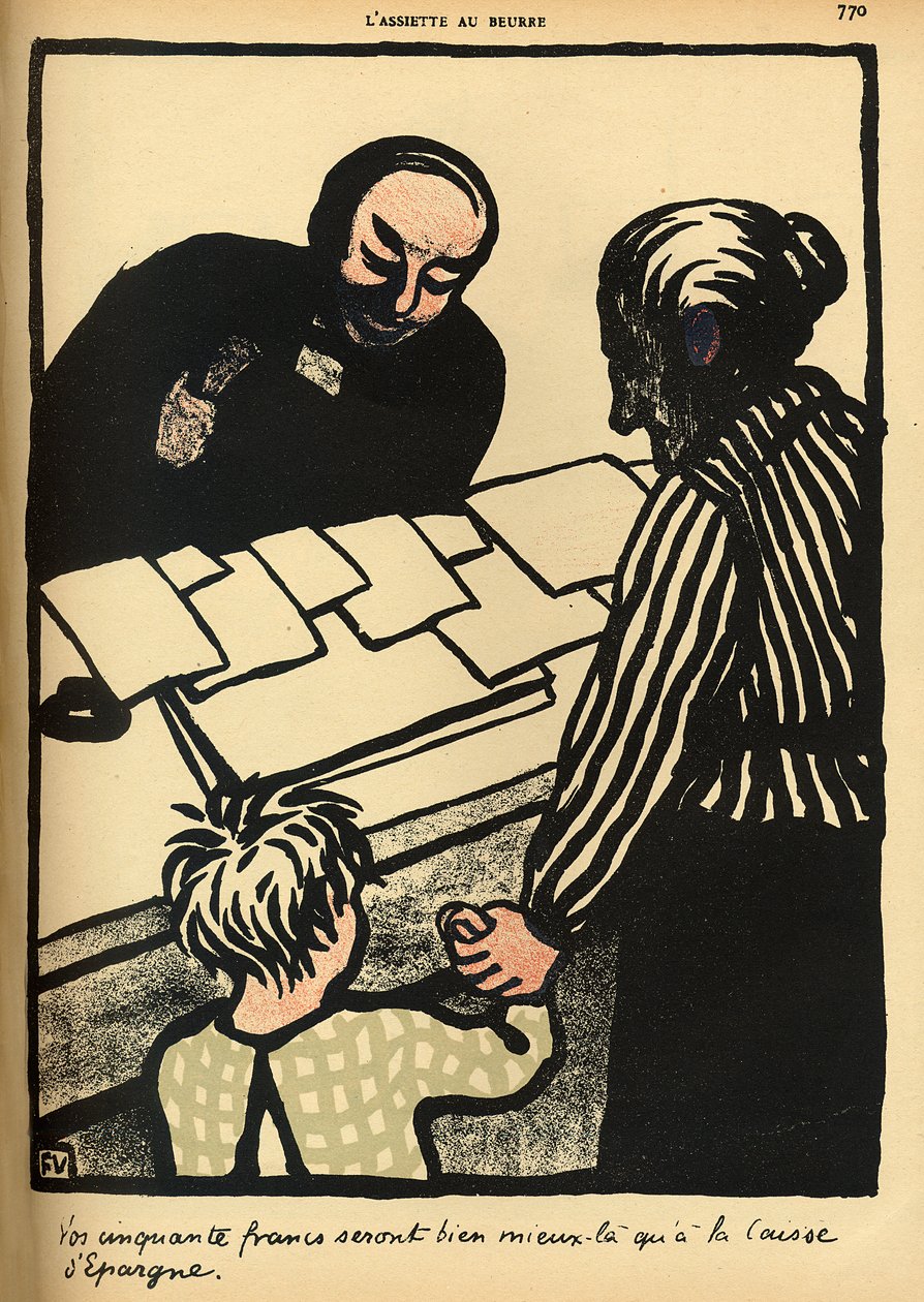 Een vrouw en kind geven hun spaargeld aan de priester, uit 'Crimes and Punishments', speciale editie van 'L'Assiette au Beurre', 1 maart 1902(A woman and child hand over their savings to the priest, from 'Crimes and Punishments', special edition of 'L'Assiette au Beurre', 1st March 1902 )Felix Edouard Vallotton |