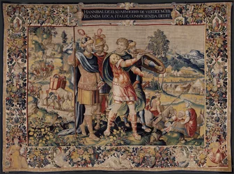 Vlaams wandtapijt. Serie De Geschiedenis van Hannibal. De plundering van Cannae. Vierde wandtapijt van de bewaarde. Modellen Anonieme meester van Nederland. Manufacture Brusselse werkplaatsen. Ca 1570. Wol en zijde, 6,5/7(Flemish tapestry. Series The History of Hannibal. The plunder of Cannae (El botín de Cannas). Fourth tapestry of those preserved. Models Anonymous master of the Netherlands. Manufacture Brussels’ workshops. Ca 1570. Fabric Wool and silk, 6,5/7 warps per cm)Flemish School |