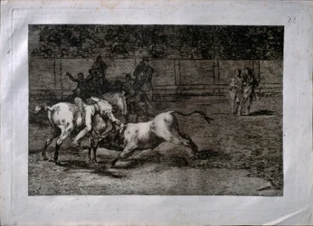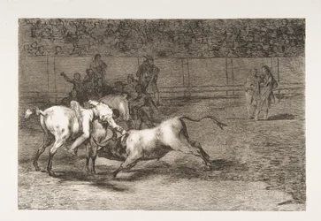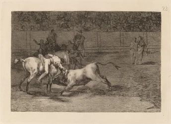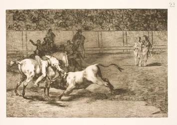 De krachtige Rendon steekt een stier met de lans, het incident dat zijn dood veroorzaakte in de arena van Madrid Een Spaanse Ruiter die Breekt Paard wordt door een stier tegen de grond geslingerd El esforzado Rendon picando un toro, de cuya suerte murio en plaza de Madrid Mariano Ceballos doodt een stier Picador gevangen door een stier Plaat 27 uit de Tauromaquia: De beroemde picador, Fernando del Toro, trekt de fier... Twee picadors worden een voor een omvergeworpen door een enkele stier Plaat 29 van de Tauromaquia: Pepe Illo maakt de pas van de recorte Stierengevecht in een gedeeld ring, uit Pepe Illo voert een "recorte" uit De gevierde picador, Fernando del Toro, provoceert de woeste stier met zijn lans Pepe Illo maakt de passe van de stier Paard Omvergeworpen door een Stier, Plaat B uit La tauromaquia (derde editie) Een stierenvechter, zittend op de schouders van een helper, steekt een stier Picador Gevangen door een Stier, uit De Stieren van Bordeaux Banderillas met bliksemschichten Stierengevechten: Mariano Ceballos, Alias de Indiaan, Doodt de Stier Vanaf Zijn Paard De Stieren van Bordeaux: Picador Gevangen door een Stier, 1825 De Beroemde Amerikaan, Mariano Ceballos