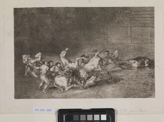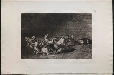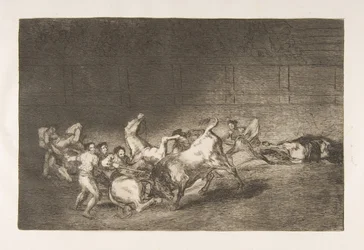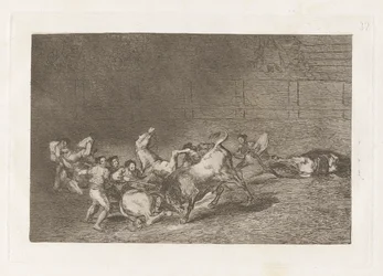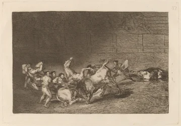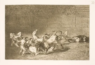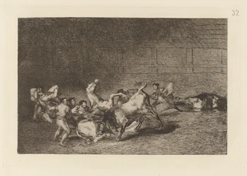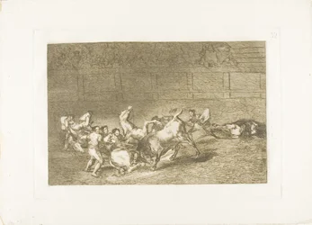 Dos grupos de picadores arrolados de seguida por un solo toro, Plaat 32 uit La tauromaquia(Dos grupos de picadores arrolados de seguida por un solo toro (Two Teams of Picadors Thrown One After the Other by a Single Bull), Plate 32 from La tauromaquia)Francisco de Goya |