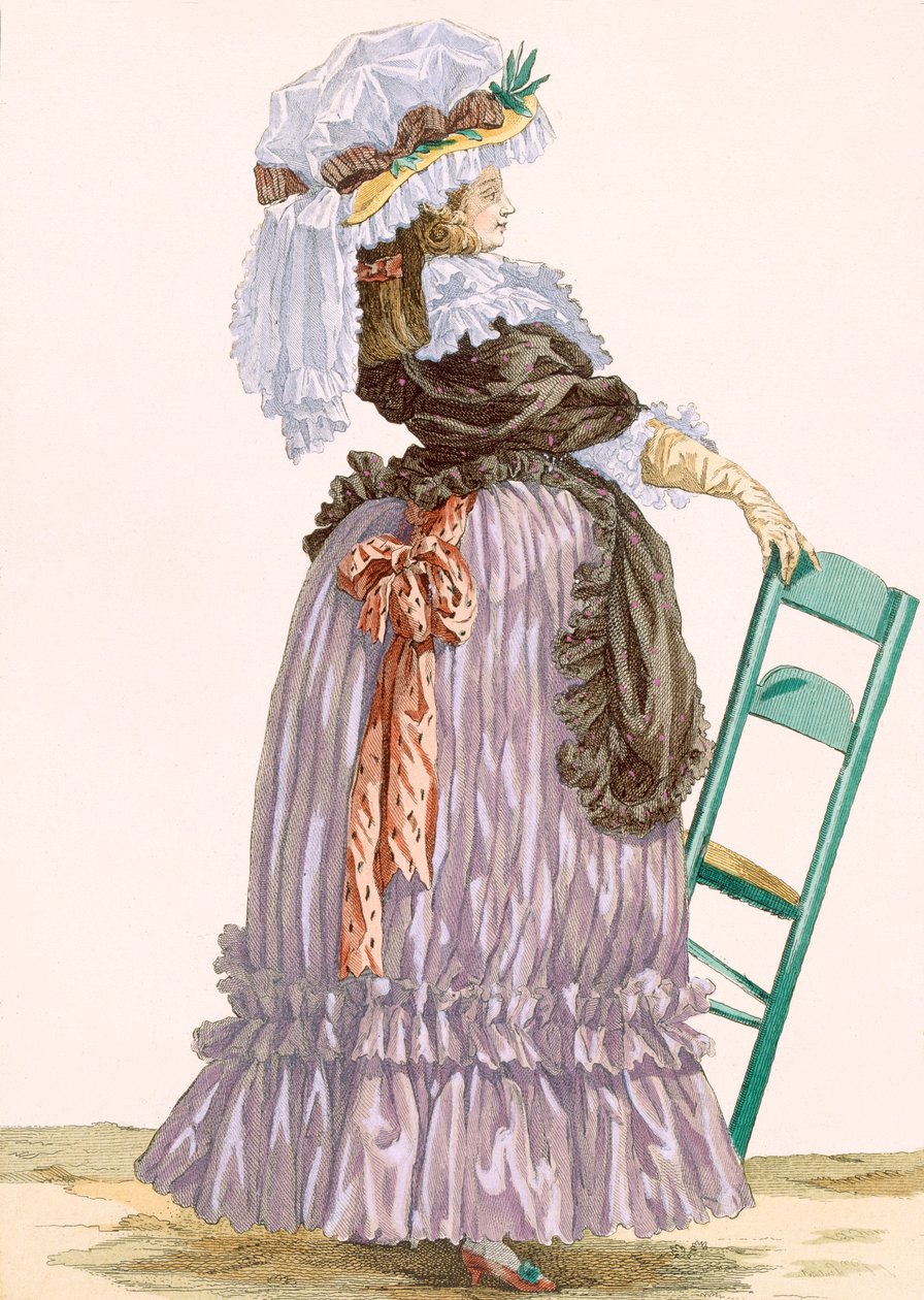 Dame leunend op stoel, gegraveerd door Dupin, plaat nr. 201 uit 'Galeries des Modes et Costumes Francais', ca. 1778-87(Lady leaning on chair, engraved by Dupin, plate no.201 from 'Galeries des Modes et Costumes Francais', c.1778-87 )Francois Louis Joseph Watteau |