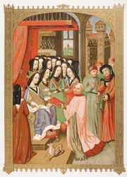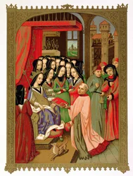 Het Hof van Maria van Anjou (1404-63) facsimile van een miniatuur uit 'Twelve Perils of Hell', uit 'Le Moyen Age et La Renaissance' door Paul Lacroix (1806-84) gepubliceerd 1847(The Court of Mary of Anjou (1404-63) facsimile of a miniature from 'Twelve Perils of Hell', from 'Le Moyen Age et La Renaissance' by Paul Lacroix (1806-84) published 1847 )French School |