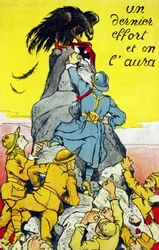 Poster 'Een laatste inspanning en we hebben het': bondgenoten (Frankrijk, VS, Rusland, enz.) bereiken de top van een rots bezet door de Duitse adelaar. Lithografie 1917.(Poster “”” One last effort and we will have it”””: allies (France, USA, Russia, etc...) reaching the top of a rock perched by the German eagle. Lithograhie 1917.)French School |