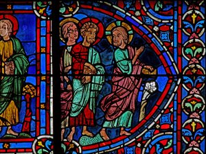 Een scène uit het leven van St. Thomas: Christus ontvangt de boodschapper van Gundaphorus en vertelt St. Thomas naar India te gaan(Window w213 depicting a scene from the life of St Thomas: Christ (recives Gundaphorus messenger?) and tells St Thomas to go to India )French School |