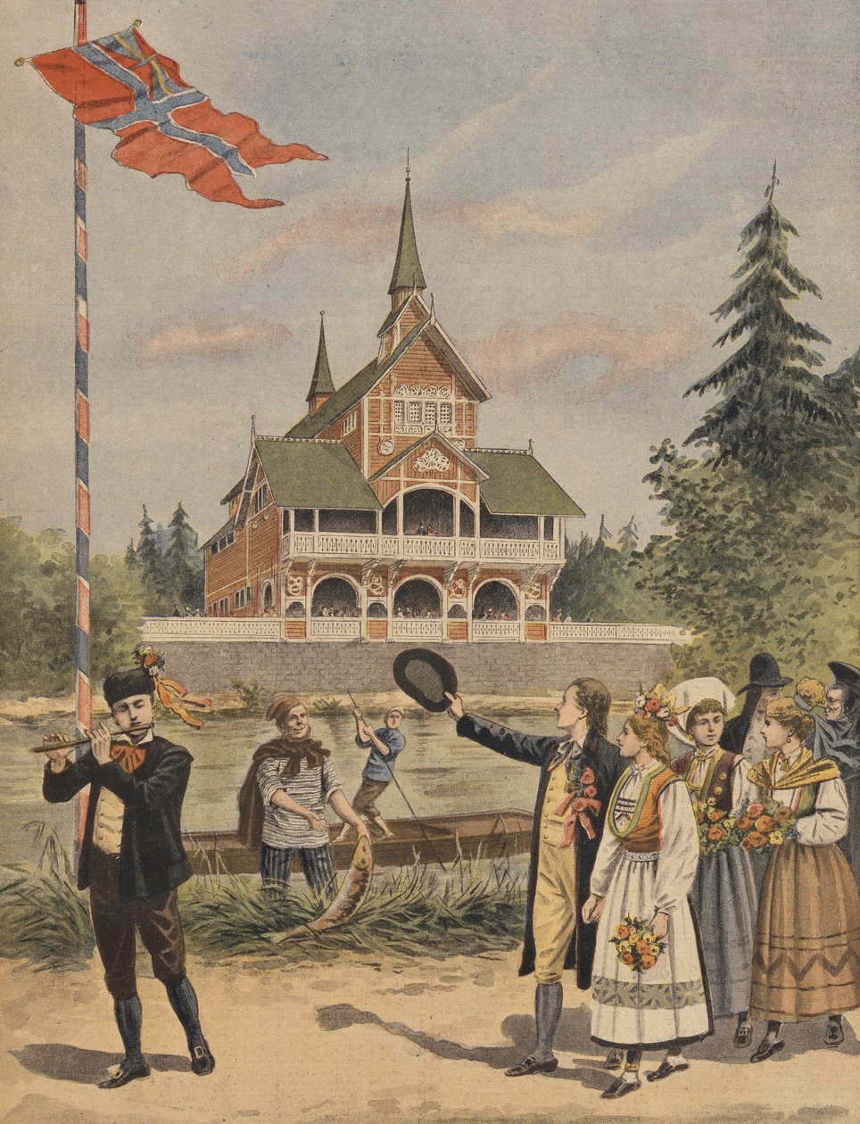 Het Noorse Paviljoen op de Wereldtentoonstelling van 1900, Parijs, illustratie uit Le Petit Journal(The Norwegian Pavilion at the Universal Exhibition of 1900, Paris, illustration from Le Petit Journal, supplement illustre, 13th May 1900 )French School |