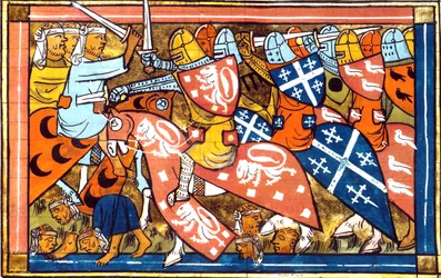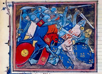 Ms FR 22495 f.265v Slag bij Damietta in Egypte in 1218-1219, tijdens de vijfde kruistocht (1217-1221) uit Historia door Guillaume de Tyr, 1337(Ms FR 22495 f.265v Battle of Damietta in Egypt in 1218-1219, during the fifth crusade (1217-1221) from Historia by Guillaume de Tyr, 1337 )French School |