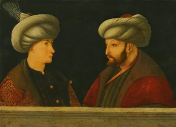 Portret van Sultan Mehmed II (1432-81) met een jonge dignitaris(Portrait of Sultan Mehmed II (1432-81) with a young dignitary (oil on wood))Gentile (school of) Bellini |