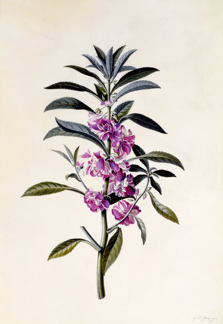 Tuimelbalsamien, Impatiens balsamina, c.1746(Garden Balsam, Impatiens balsamina, c.1746 (hand-coloured engraving))Georg Dionysius Ehret |