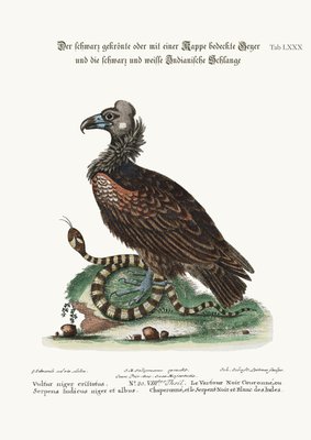 De gekuifde of gekapte zwarte gier en de zwart-witte Indiase slang(The Crested or Coped Black Vulture, and the Black and White Indian Snake, 1749-73 )George Edwards |
