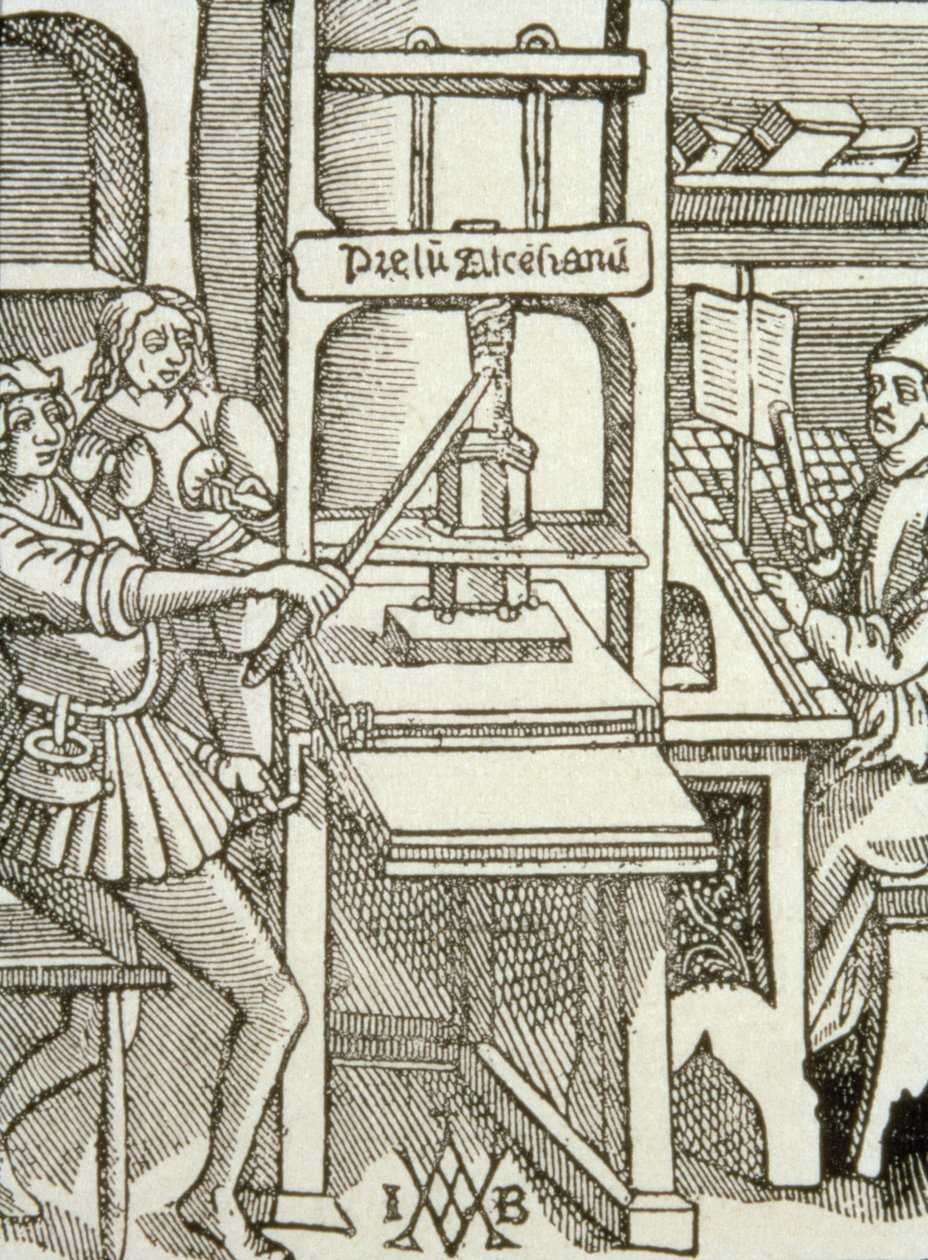 Drukpers van 1498, uit een boek gedrukt in dat jaar(Printing Press of 1498, from a book printed in that year )German School |