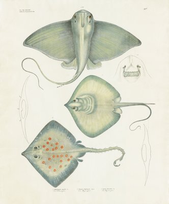 Vreemde roggen(Strange rays (coloured engraving))German School |