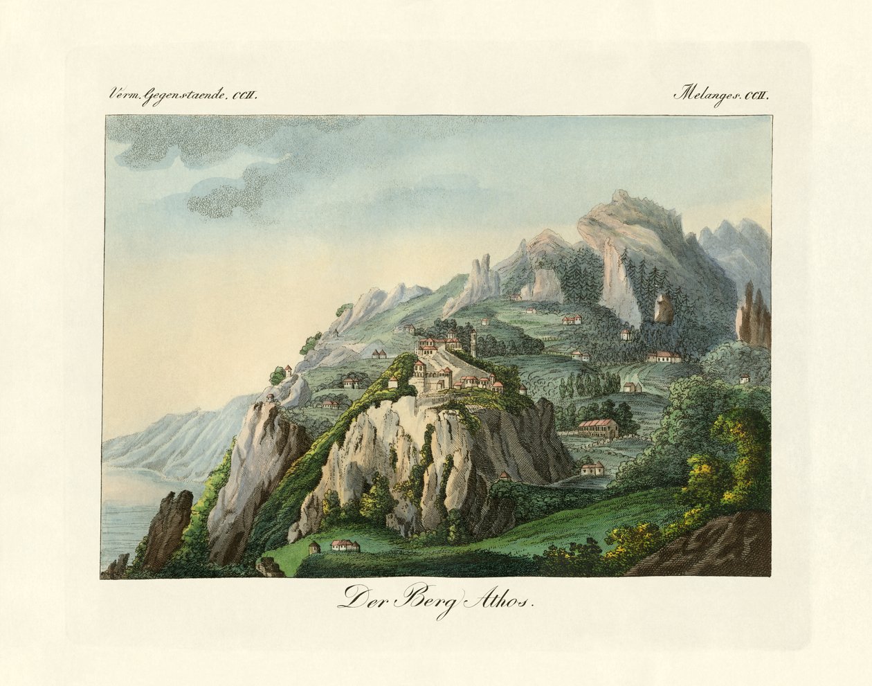 Uitzicht op de berg Athos(View of the Mount Athos (coloured engraving))German School |