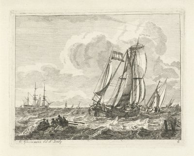 Zeilschepen en een roeiboot op open water(Zeilschepen en een roeiboot op open water Zeegezichten met schepen (series title))Gerrit Groenewegen(print maker),Gerrit Groenewegen(after drawing by) |