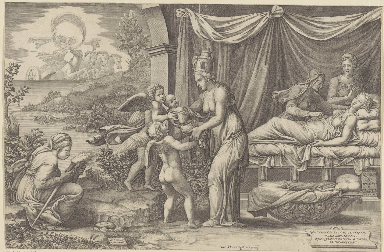 Allegorie op de Geboorte(Allegory of Birth)Giorgio Ghisi(print maker),Girolamo da Pontremoli (possibly)(after painting by),Giulio Romano(after design by) |