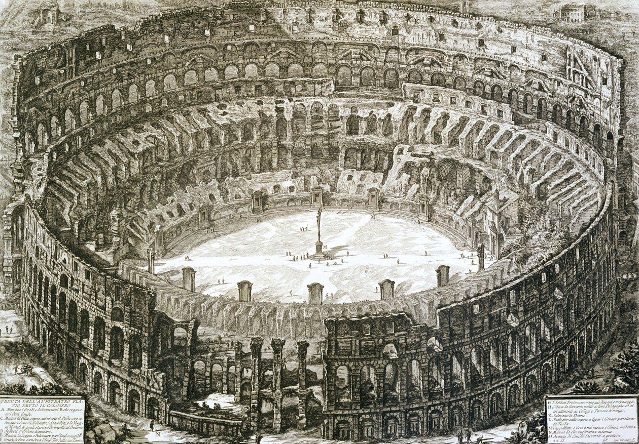 Luchtfoto van het Colosseum in Rome uit 'Views of Rome', voor het eerst gepubliceerd in 1756, gedrukt in Parijs 1800(Aerial view of the Colosseum in Rome from 'Views of Rome', first published in 1756, printed Paris 1800 )Giovanni-Battista Piranesi |