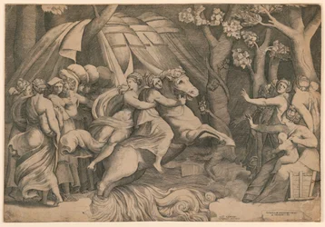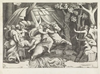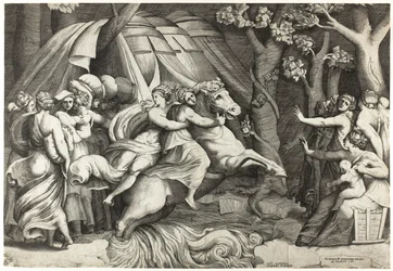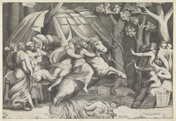 Cloelia te paard over de Tiber, ca. 1540-60(Cloelia on horseback crossing the Tiber, ca. 1540-60. )Giulio Bonasone |