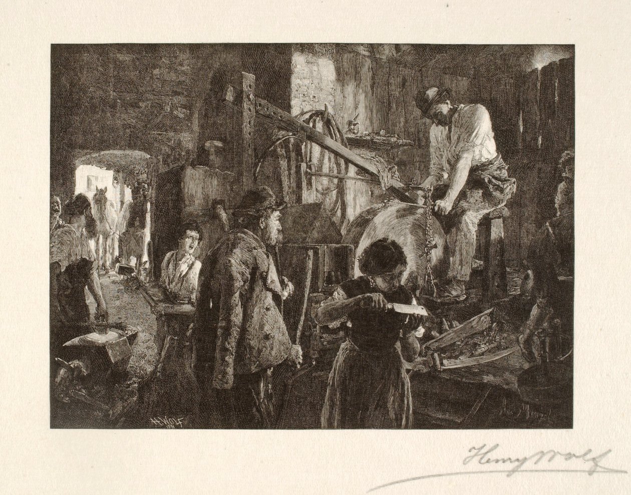 Gereedschap slijpen in een dorpssmederij(Sharpening Tools in a Village Smithy)Henry Wolf,Adolph Menzel |