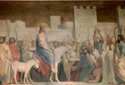 Christus' intocht in Jeruzalem op Palmzondag (detail)(Christ's entrance to Jerusalem on Palm Sunday: the inhabitants greet him with joy by spreading their clothes on the floor, wielding olive branches. Detail of a fresco by Hypolithe Flandrin (1809-1864) 19th century Church of Saint Germain des Pres, Paris)Hippolyte Flandrin |