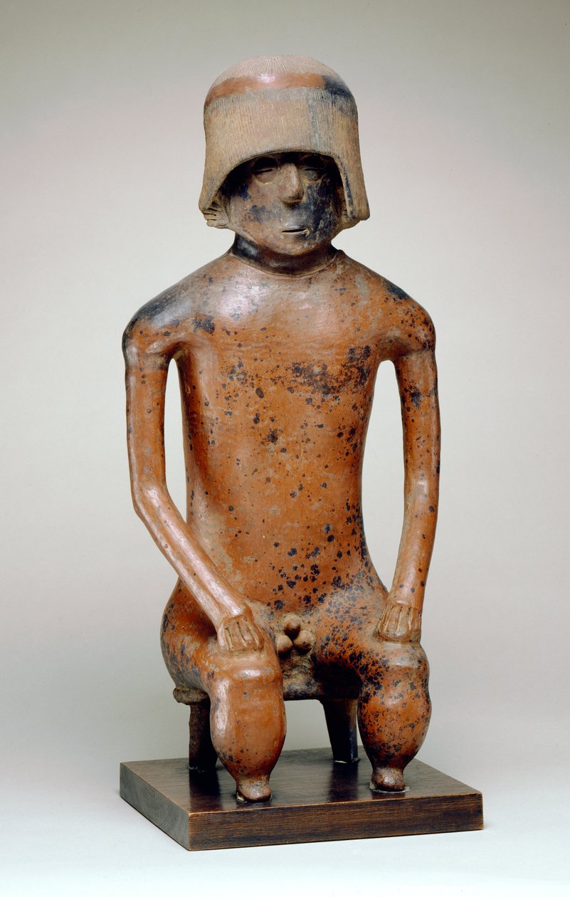 Zittende man met helm(Seated male with helmet (earthenware))Jalisco |