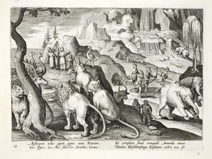 Holbewoners die olifanten achtervolgen, plaat 3 uit de serie Venationes Ferarum, Avium, Piscium(Cavemen Chasing Elephants, plate 3 from the Venationes Ferarum, Avium, Piscium series)Jan van der Straet, called Stradanus(Designer),Jan Collaert II(Engraver),Philips Galle(Publisher) |